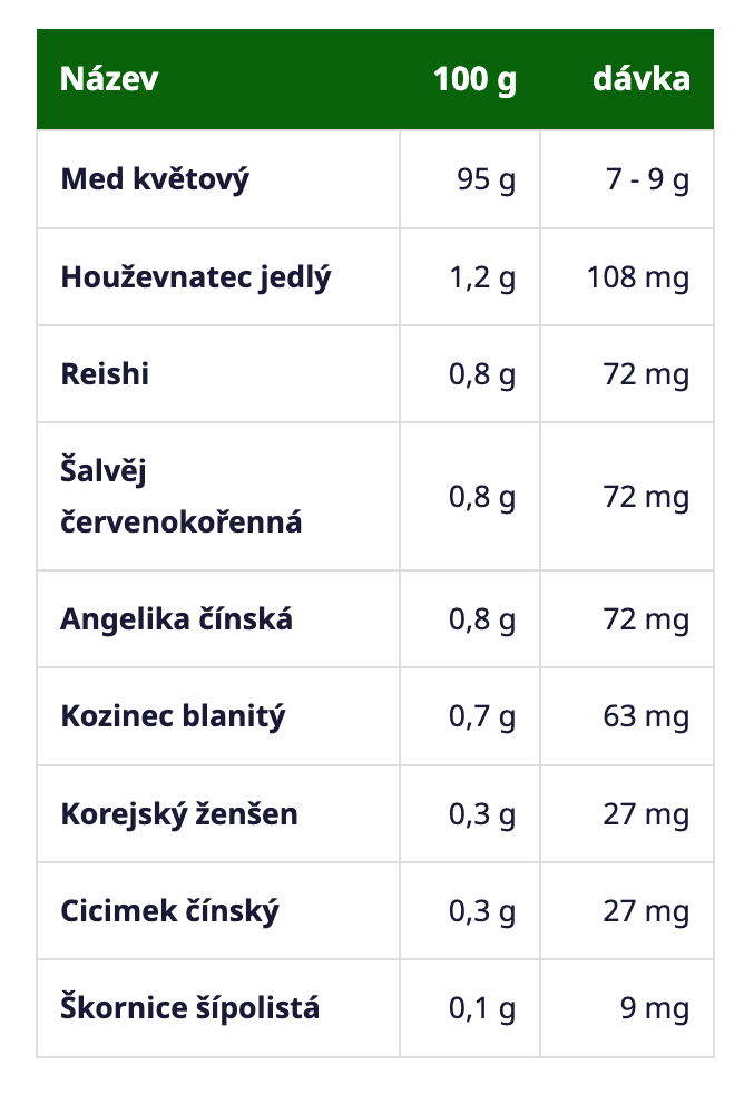 - Podpora vitality: Kombinace ženšenu a dalších adaptogenů zvyšuje energii a zlepšuje celkovou vitalitu.